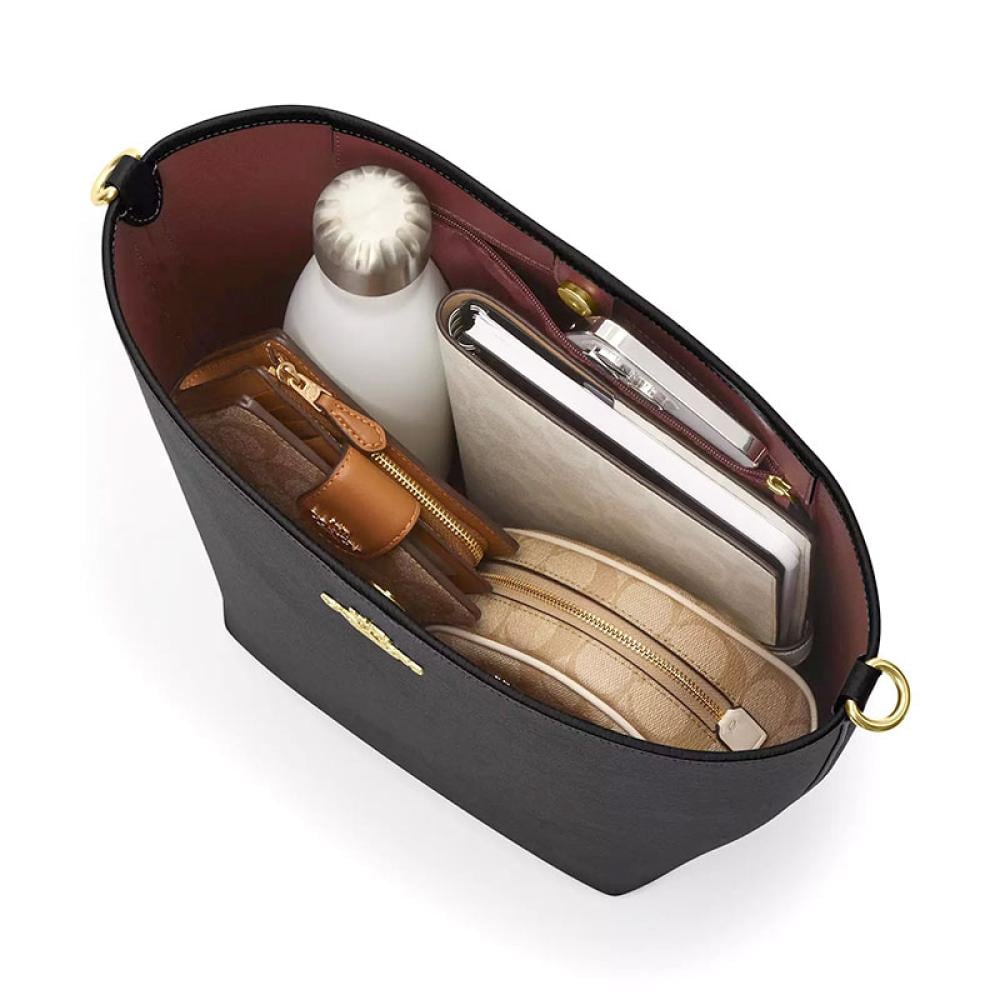 حقيبة الدلو المصممة هذه مثالية لحمل كل ما هو ضروري - المحفظة والهاتف وحتى الكمبيوتر اللوحي الصغير - بسهولة، بفضل تصميمها الداخلي الواسع وإغلاقها السريع.